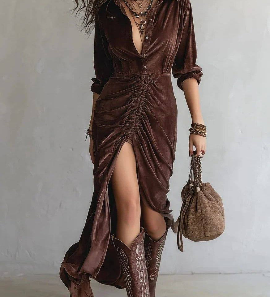 VERONIQUE | Robe longue en velours plissé