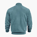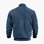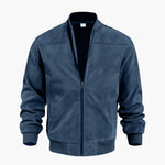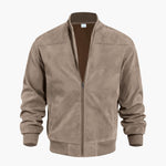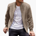 This men's bomber jacket features a stand-up collar, a front zipper closure, and long sleeves with ribbed cuffs. Two welt pockets are placed at the waist. The ribbed hem ensures a neat finish. The suede-like outer surface provides a polished look and can be worn with various styles.