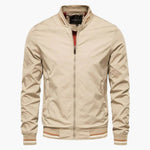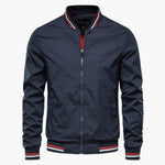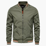 Adopt a revamped everyday style with this classic men's bomber jacket, designed to combine style and functionality. This model features a full-length zip closure, ribbed cuffs, and a striped collar, adding a sporty touch to any outfit. Its tailored fit makes it suitable for daily wear, while its clean look works well for outings with friends or city trips. Available in several colors, it pairs easily with jeans, chinos, or dress pants to vary your styles.