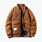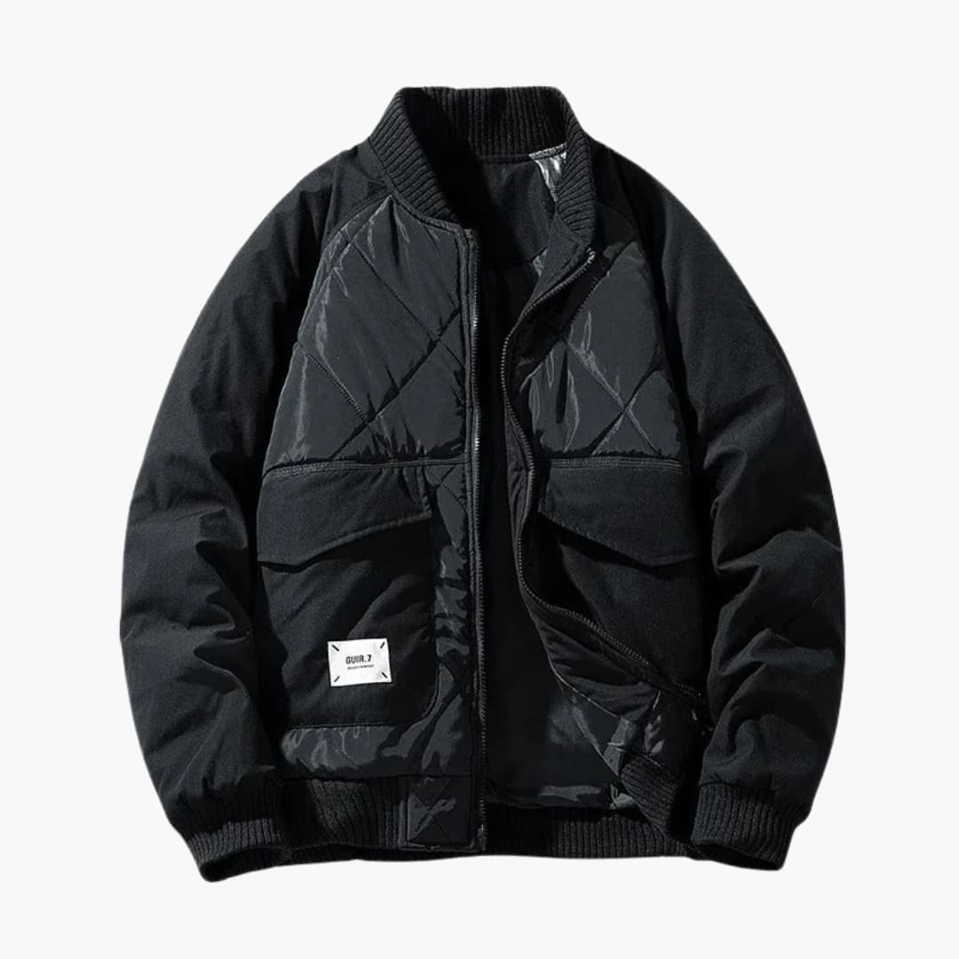 This men's bomber jacket features a ribbed collar followed by a full front zipper closure. Two flap pockets are placed on the lower front, accompanied by a sewn label. The long sleeves end with ribbed cuffs, while the hem is also ribbed. The exterior features sewn quilted panels.