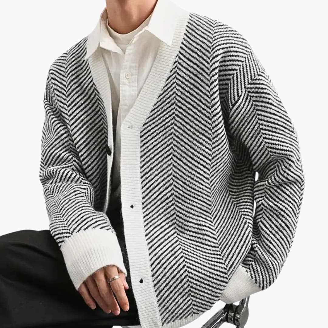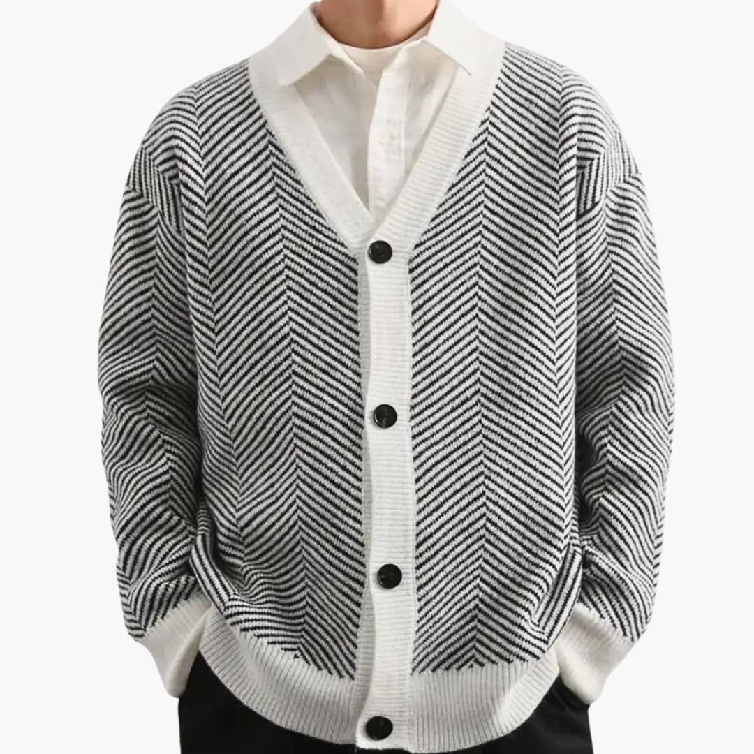 This men's knitted cardigan features a V-neck and a button closure at the front. Its long sleeves end with ribbed cuffs. The straight hem is reinforced with a ribbed finish. The striped knit pattern, arranged in chevrons, adds contrast and visual character.