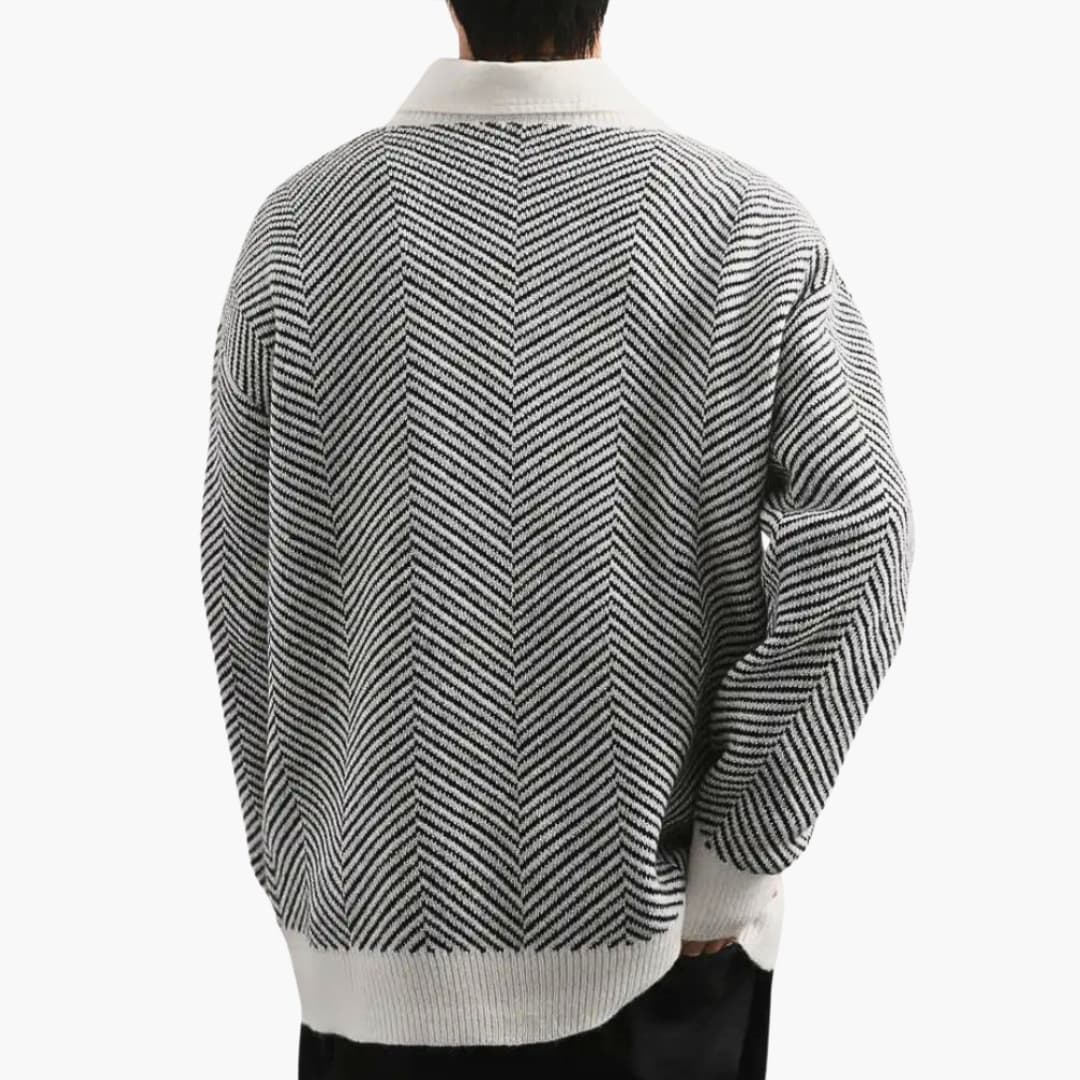 Men's knitted cardigan with buttons and striped pattern.