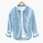 This men's shirt features a button closure on the front and a single chest pocket. It has long sleeves with buttoned cuffs and a flat hem. Its woven denim surface offers a uniform and structured texture, suitable for layered wear in any season.