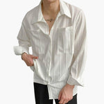 This men's shirt features a classic collar, a full-length button closure, and long sleeves with cuffs. Two patch pockets are positioned on the chest. Its ribbed surface provides a subtle texture. The straight hem ensures a simple fit, suitable for wearing alone or layered. Machine washing at home is possible for regular care.