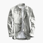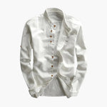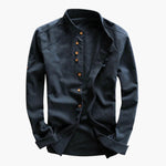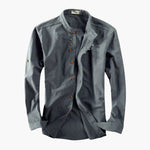 Men’s long-sleeve shirt with stand-up collar and front buttons.
