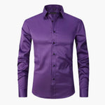 This long-sleeved men's shirt features a pointed collar, a button closure at the front, and adjustable cuffs. The surface has a fine texture for a neat appearance. The added stretch provides better freedom of movement, while the straight hem maintains a balanced line, whether worn tucked in or layered.