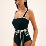 Indulge in effortless elegance with the Coastal Belted One-Piece, a stunning swimsuit designed for timeless sophistication. Featuring a chic square neckline, wide supportive straps, and contrast white trim, this piece is both modern and refined. The waist-cinching tie belt adds a touch of structured glamour, accentuating your curves while keeping things effortlessly stylish.