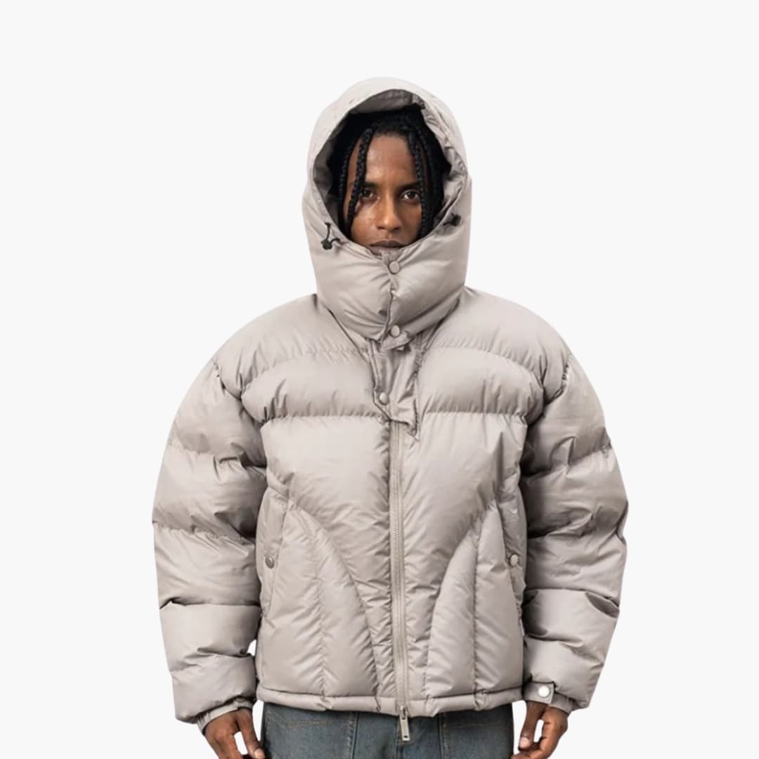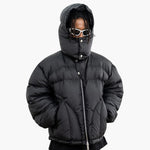 • Collar and hood: Stand-up collar with quilted hood covering the head and neck.