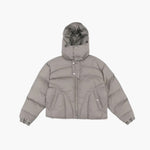 This men's down jacket features a stand-up collar with integrated hood, a central zipper, and a snap-button flap. Two slanted front flap pockets offer practical storage space. The long sleeves end with elastic cuffs, while the straight hem completes the padded quilted surface suitable for cold seasons.