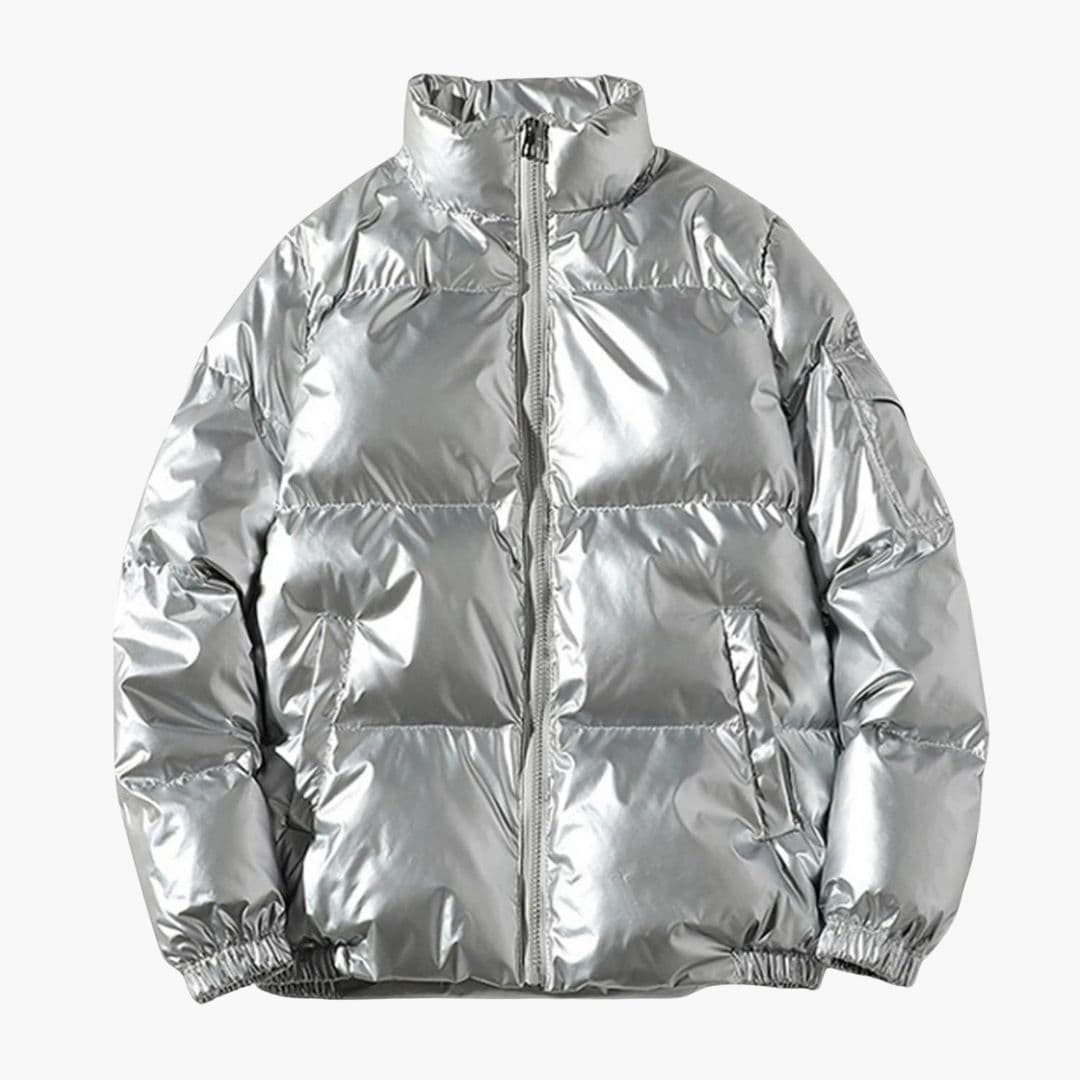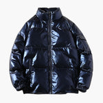 Men's shiny down jacket with stand-up collar, zip closure, and long sleeves.