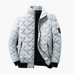 Men's quilted down jacket with stand-up collar and zippered pockets.