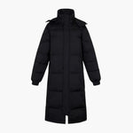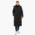 This men's long down jacket is designed with a quilted structure and extended length. The integrated hood limits exposure to wind and snow. The full-length zip closure with concealed flap offers a snug fit. The elastic cuffs help retain warmth. This model is suitable for cold days and daily use during winter outdoor activities.