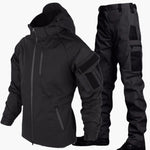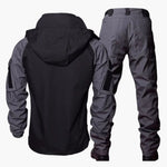 Men's outdoor set jacket and utility pants with multiple pockets.