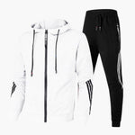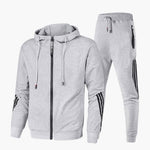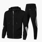 Men's tracksuit set with zip-up hooded jacket and drawstring pants.