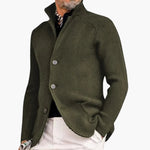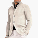 This men's cardigan features a stand-up collar and a button closure on the front. It has long sleeves with straight cuffs and a slightly rounded hem. Its textured knitted surface creates a structured effect suitable for layering in various fashion contexts.