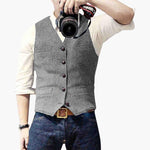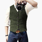 This men's vest features a V-neck collar, button closure at the front, and a sleeveless cut. The fitted shape includes two welt pockets at the waist and two on the chest, with a plain woven surface. The straight hem and clean lines allow it to be worn with a shirt or jacket.