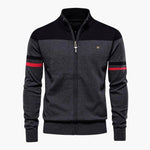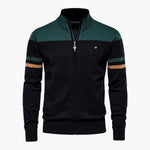 This men's zip-up vest features a ribbed stand-up collar and a full front closure. It has contrasting stripes on the chest and sleeves forming a regular pattern. The ribbed cuffs and hem maintain the garment's shape, while the regular knit presents a uniform texture.