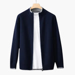 This men's zip-up vest features a ribbed stand-up collar and a full-length zip closure. The long sleeves and straight hem create a clean line. The smooth knit highlights a uniform texture suitable for various outfit combinations.