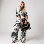 Turn heads with this effortlessly chic two-piece set featuring a printed V-neck top and wide-leg pants. Crafted in lightweight fabric, it offers the perfect mix of elegance and comfort, making it your go-to outfit for summer evenings, special events, or stylish weekends. With its flowing silhouette and striking print, this set is all about feeling confident and free while staying cool and comfortable.