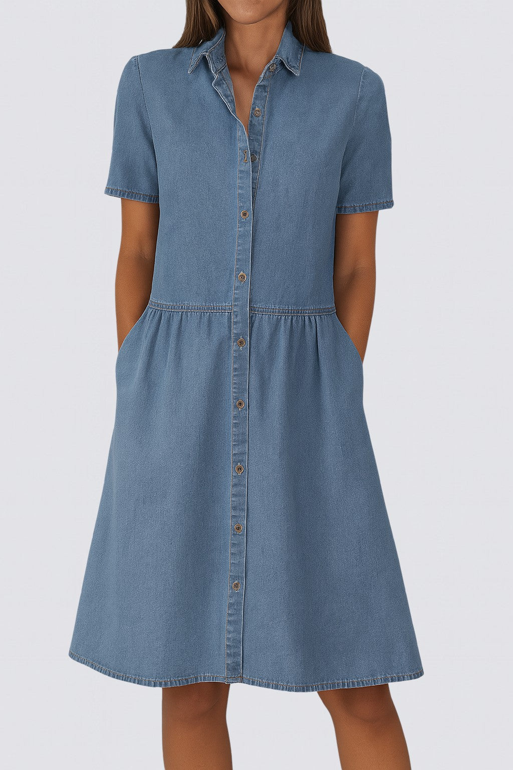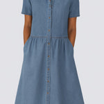 This button-down denim dress is the ultimate blend of timeless style and casual comfort. With its collared neckline, short sleeves and flattering A-line cut, it’s designed to keep you looking polished without ever feeling overdressed. Perfect for everything from weekend markets to casual Fridays, it’s a true wardrobe essential.
