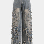 Unleash your edgy side with the Juno Distressed Wide-Leg Jeans. These bold, light-wash jeans feature intricate frayed detailing that creates a unique, distressed pattern down the front, offering a perfect blend of casual and rebellious style. The relaxed, wide-leg fit provides comfort and freedom, making them an ideal choice for a bold, fashion-forward look.