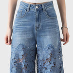 Make a stylish statement with the Lace-Detail Patchwork Wide-Leg Jeans. Blending edgy denim with delicate lace accents, these jeans offer a unique mix of bold and feminine. The intricate cut-out lace detailing adds a touch of elegance, while the wide-leg fit keeps them effortlessly chic and comfortable.