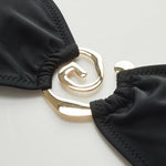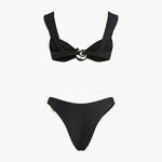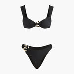 Make a statement with the Midnight Luxe Bikini Set, a bold and sophisticated two-piece designed for effortless glamour. The structured top features wide straps and a gold-tone ring detail, adding a touch of elegance to the classic black design. The matching bikini bottoms offer a sleek, minimal silhouette with a subtle gold accent for a luxe finish.
