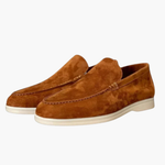 Men's suede loafers with slip-on entry and white slip-resistant sole