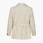 This men's jacket features a notched collar and a button closure on the front. It includes four flap pockets: two on the chest and two at the hips, all secured with a button. The sleeves end with buttoned cuffs. A matching belt allows for waist adjustment as needed. The look is enhanced by fine vertical stripes for an elegant and elongated appearance.