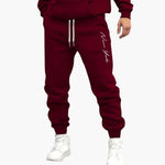 Men's jogging pants with adjustable waist and printed pattern on the leg.