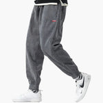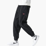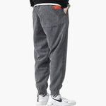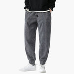 Men's jogging pants with vertical ribs, elastic waist, and side pockets.
