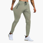 These men's pants feature an elastic waistband with a drawstring, zippered side pockets, and offer stretch in all directions. The legs are equipped with zippers at the ankles. Its plain woven finish is suitable for both indoor and outdoor use. This model combines a flexible belt, secure storage, and adjustable leg cuffs.