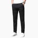 These men's outdoor pants have an elastic waistband with button closure and side pockets. They feature a straight cut with hemmed bottoms and a plain woven surface. Suitable for regular and outdoor use, the pants retain their shape and overall appearance.