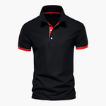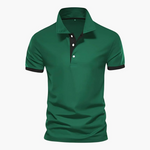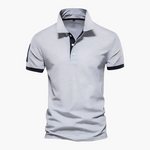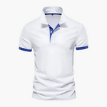Men's short-sleeve polo with contrast collar and buttoned placket.