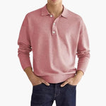 This men's polo features a flat collar and a three-button placket at the neckline. It has long sleeves and a straight hem in structured knit. Its regular fit and smooth surface are suitable for everyday wear and transitional seasons.