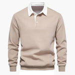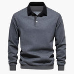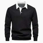 This men's polo features a classic collar with a short buttoned placket at the front. The long sleeves end with fitted cuffs. The straight cut follows a regular line on the torso. The bottom hem is straight and the smooth woven surface has a uniform and neat appearance.