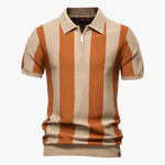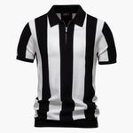 This men's polo features a classic collar and a short front zipper. The short sleeves are finished with ribbed edges, while the hem includes a ribbed border for a defined shape. The vertical stripe pattern provides a structured look, suitable for everyday wear during summer.