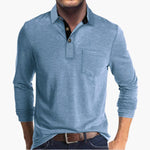 This men's polo features a classic polo collar with a partial button placket. The long sleeves end with narrow, refined cuffs. A chest pocket is placed on the left side for added practicality. The straight hem and smooth surface give a structured look, suitable for various occasions, from the office to casual outings.