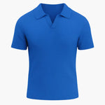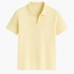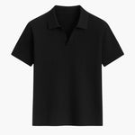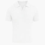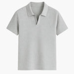 This men's polo features an open collar and short sleeves. The ribbed knit surface offers a neat appearance and a subtle texture. Designed with a straight hem and a standard fit, this top suits different styles and can be worn alone or layered depending on the occasion.