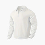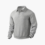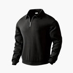 This men's sweater features a turn-down collar with a half-zip closure. Its textured knit highlights a regular relief, while the ribbed cuffs and hem maintain the garment's shape. This knit model suits various outfit combinations.
