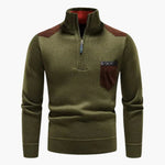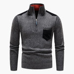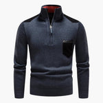 This men's half-zip sweater features a ribbed stand-up collar and long sleeves. It includes a contrasting chest pocket with a simple trim and shoulder panels creating a visual contrast. The ribbed hem and cuffs maintain the garment's shape, while the regular knit highlights a uniform texture.