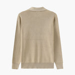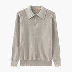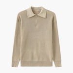 This men's sweater features a mid-height flat collar with a front zip closure. The textured, solid knit extends across the entire body and sleeves. The long sleeves end with wide ribbed cuffs, and the ribbed hem adds structure to the waist. The straight cut allows layering this model in various styles.