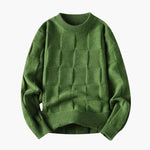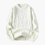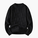This model features a crew neck, no front opening, no pockets, long sleeves, and a ribbed hem. The surface has a checkered pattern throughout the piece, creating texture. The classic cut offers a straight silhouette at the chest and sleeves. The ribbed edges are placed at the neck, cuffs, and hem.