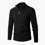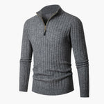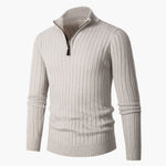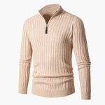 This men's pullover features a stand-up collar with a half-zip closure. The ribbed knit surface extends vertically over the body and sleeves. The long sleeves and ribbed cuffs provide a snug fit. A ribbed straight hem offers a neat finish. No additional details or pockets are visible.