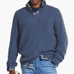 This men's sweater features a stand-up collar with a front zip closure. The ribbed knit extends over the entire body and sleeves. The long sleeves end with ribbed cuffs, and the straight hem has a straight cut. Its classic fit is suitable to wear over a shirt or with jeans on cool days.