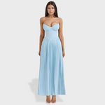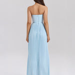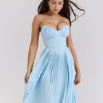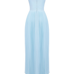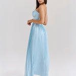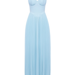 The Siena™ Maxi Dress evokes dreamy oceanic romance with its flowing silhouette and delicate pleats. Crafted from an ocean blue georgette, it features shell-shaped pleats across the bust and a structured, boned bodice that cinches the waist to perfection. The full-length pleated skirt moves gracefully with every step, making it ideal for elegant summer occasions.