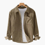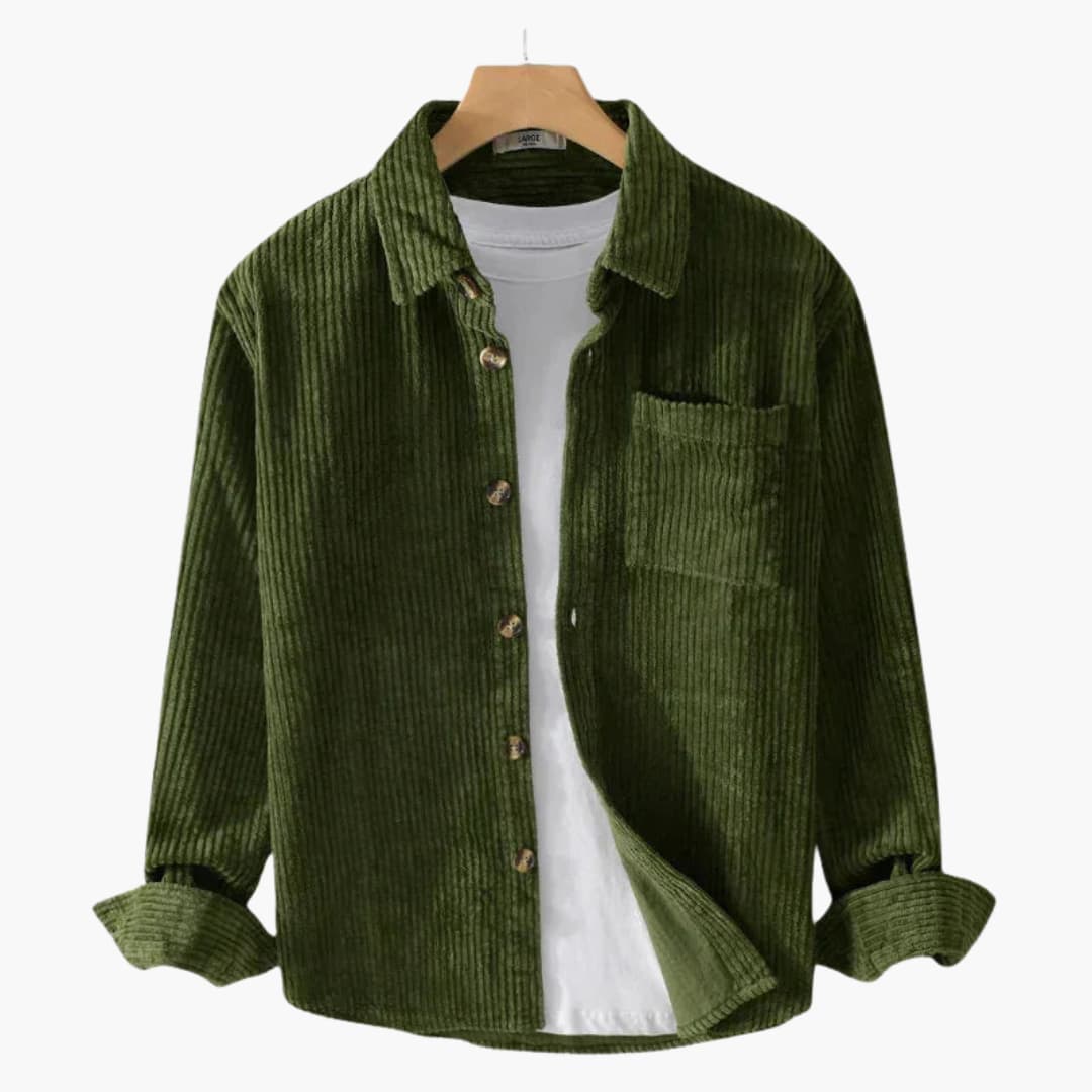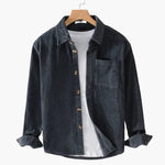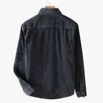 This men's overshirt features a notched collar and a full-length button closure. It includes long sleeves with buttoned cuffs and a chest pocket. The ribbed corduroy surface adds structure and relief, making it ideal to wear over a light top or alone in mid-season weather.