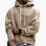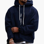This men's sweatshirt has a pullover fit, an adjustable drawstring hood, and a kangaroo pocket on the front. The long sleeves and ribbed edges ensure a classic fit. A vertical pattern is printed on the chest. Its solid surface offers a simple style that can be worn alone or layered.