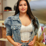 Layer it over a corset, pair it with wide-leg jeans, or contrast it with soft skirts — the Sydney Puff Sleeve Cropped Denim Jacket is your go-to for elevating basics with bold attitude.
