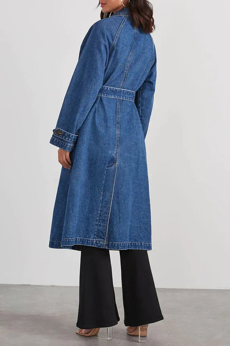 Make a bold statement with the Dakota Denim Trench, a modern take on a classic silhouette. Designed with a structured double-breasted front, oversized lapels, and a waist-cinching belt, this coat blends effortless cool with undeniable elegance. The rich denim wash and contrast stitching add a touch of edge, making it the perfect layering piece for trans-seasonal styling.